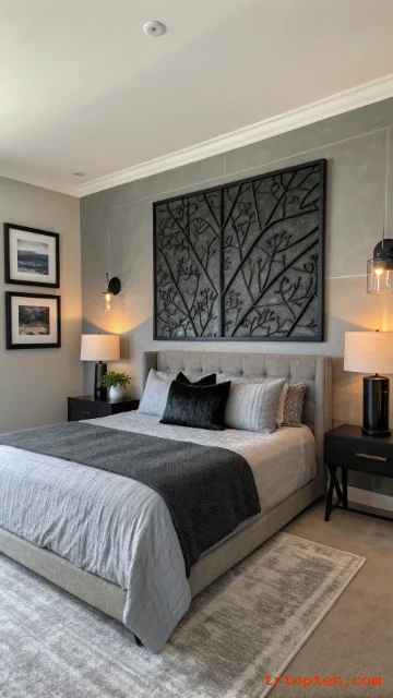 Use grey bedding with one black accent pillow. That small repeat connects the bed to the wall. Leave some blank wall space so the room can breathe.