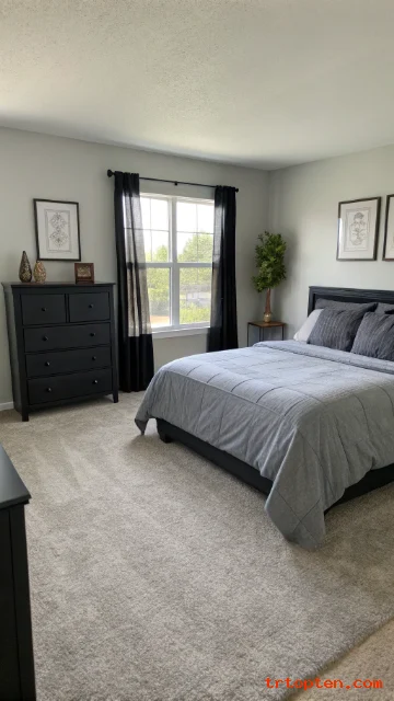 Choose furniture with simple lines so the room stays calm. Add grey bedding in a slightly lighter shade than the carpet. This helps the bed stand out.