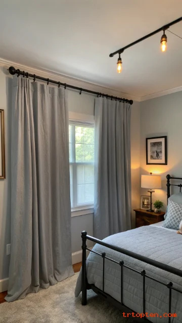 Keep the walls a light grey so curtains blend smoothly. Add black picture frames or a black bench to echo the hardware. Use bedding in grey tones with clean edges.