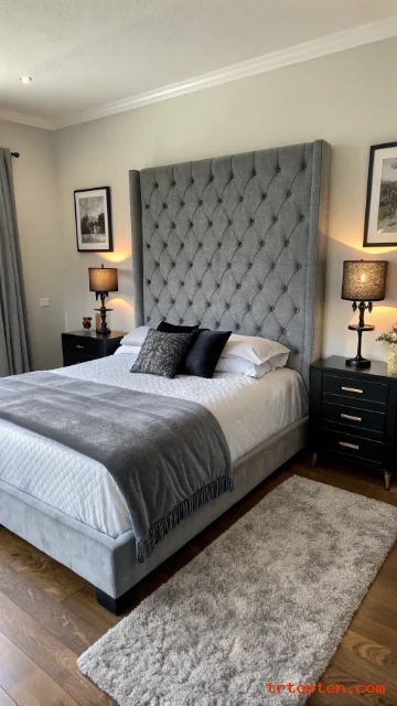 A grey velvet headboard adds softness and a touch of luxury. Black side tables create contrast and make the headboard pop. This mix feels upscale but still easy to style.