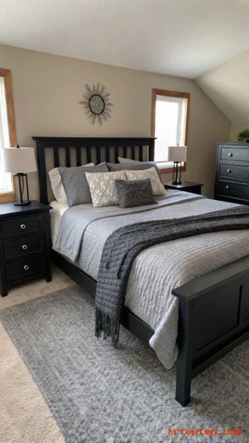 A black bed frame anchors the room and adds instant contrast. Layer bedding in light to mid-grey for a calm gradient. This setup looks polished without extra decor.