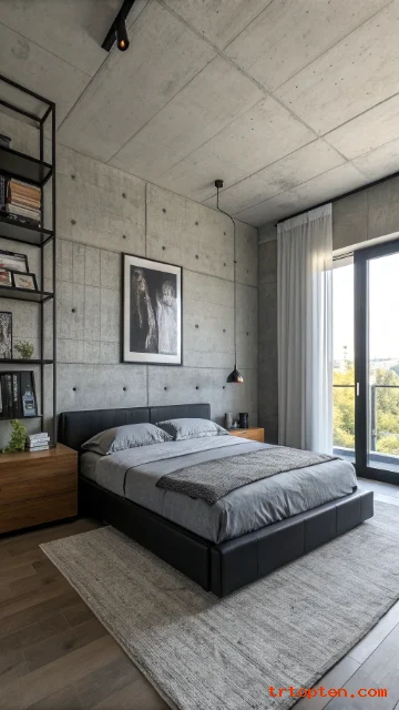 Use a grey concrete-look wall finish for a modern edge. Keep decor minimal in black to avoid visual clutter. This style works best with clean lines and open space.