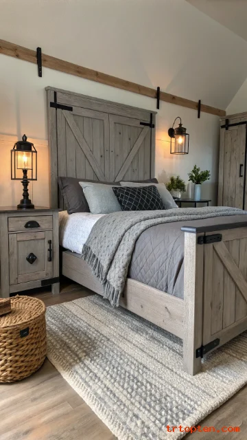 Use grey-washed wood furniture for a rustic feel. Add black metal touches like bed legs or drawer pulls. This blends cozy and modern in a simple way.