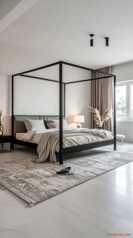 A black canopy bed creates height and drama. The frame draws the eye upward and makes the room feel grand.