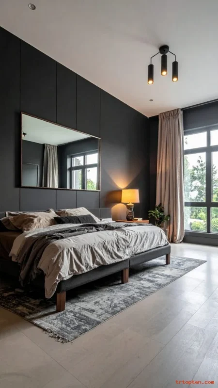 A large mirror on or near a black wall helps reflect light. This keeps the room bright while staying moody.