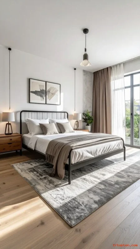 Add light bedding and a few black accents to connect the look. Use warm wood tones to keep it welcoming.