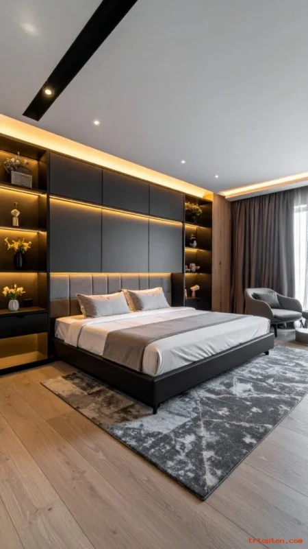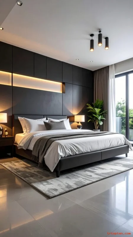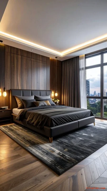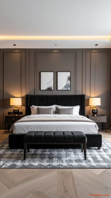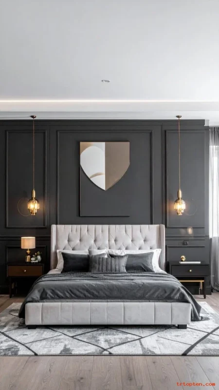 Mix charcoal bedding, black pillows, and a gray rug. Add one warm element like wood or brass. Use soft lighting and avoid harsh white bulbs. Add a cozy throw to make the bed inviting.