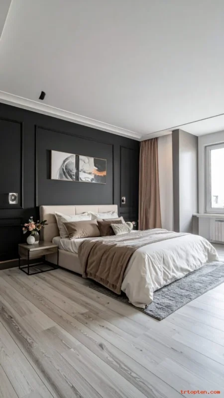 Keep the other walls light or warm white to avoid a cave effect. Add soft bedside lamps to prevent harsh shadows. Choose crisp bedding in white or cream for contrast. Hang one large artwork to keep the wall clean and strong.