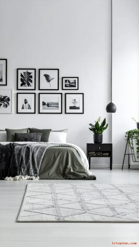 Choose black frames and white prints for wall art. Use warm bulbs to keep the room from feeling cold.