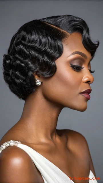 Finger waves create a vintage vibe with clean curves. The bob length keeps the look modern and wearable. It pairs well with red lipstick and classic outfits.