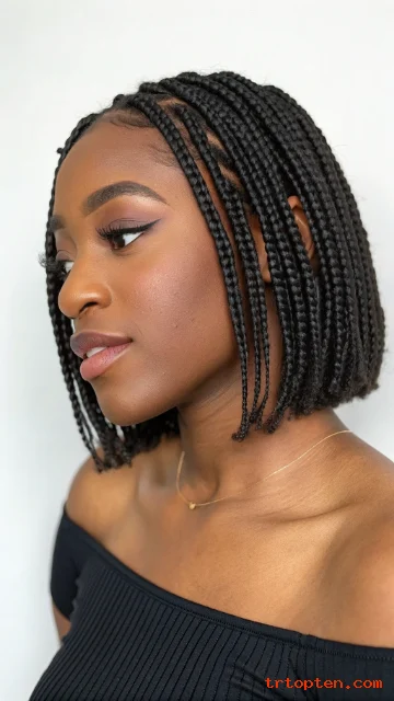 A box braid bob is protective and stylish. The length keeps braids light and easy to manage. It also shows off the bob shape in a bold way.