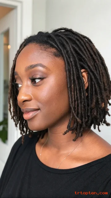 Trim locs to a blunt or slightly layered bob line. Retwist roots on a schedule that suits your hair. Use a light mist to keep locs hydrated.