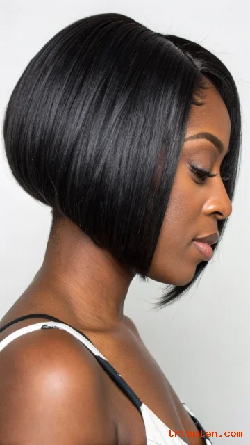 A rounded bob curves inward to create a soft bubble shape. The silhouette looks feminine and polished. It works well for straightened hair and silk press styles.