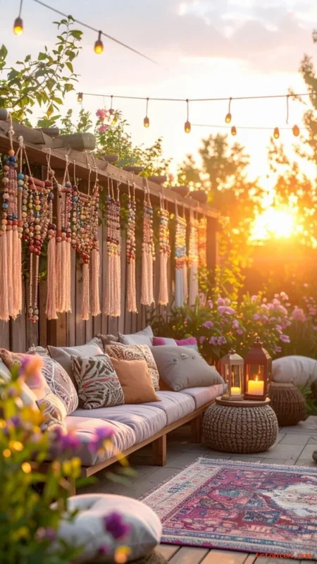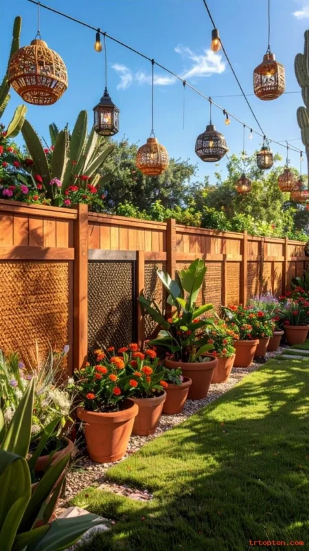 A plain fence becomes boho fast when you add Moroccan lanterns. The cutout patterns create beautiful shadows at night. This is a simple upgrade that feels rich and inviting.