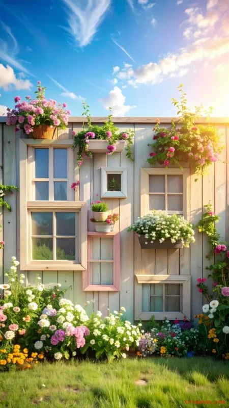 Old window frames add boho vintage charm when you mount them on a fence. They create a layered, collected look. They also reflect light and make the space feel bigger.