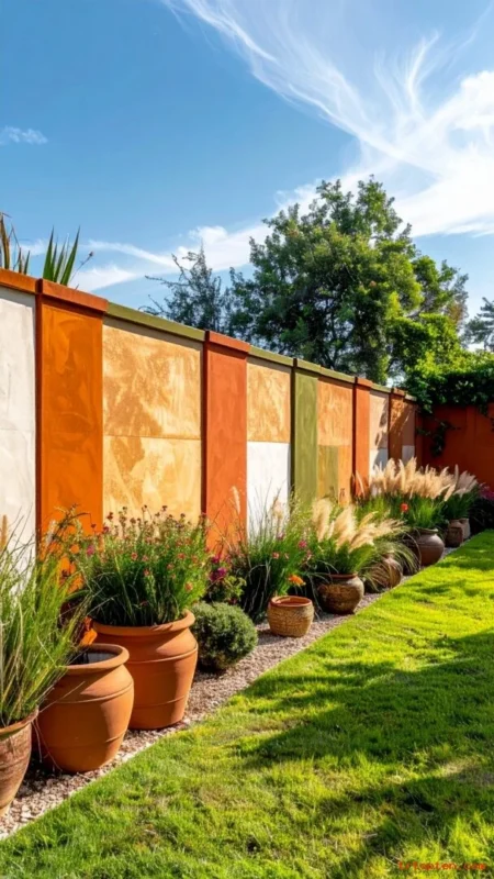 Boho style loves warm color, and a color-block fence makes a bold backdrop. Use earthy tones like terracotta, clay pink, sand, olive, and warm white. This adds art to your yard without extra clutter.
