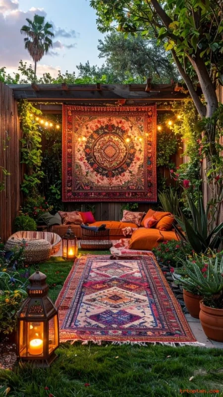 Outdoor rugs or weather-safe tapestries can act like fence art. Hang one large piece as a bold boho statement. This adds pattern and color with minimal effort.