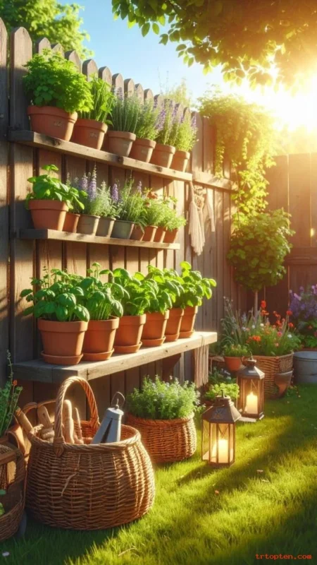 Use a mix of pot sizes to keep the display interesting. Plant herbs, succulents, or bright blooms for contrast. Water carefully so runoff does not stain the fence.