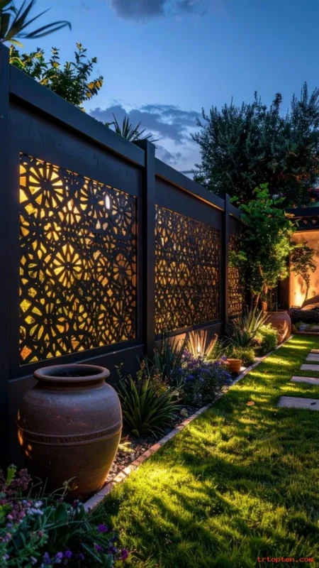 Add lighting aimed toward the fence to show the cutout shadows at night. Pair with simple greenery and textured pots. This idea looks high-end but can be done in small sections.