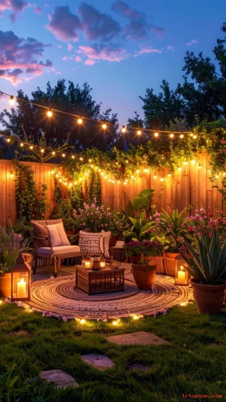 Pair the lights with natural decor like baskets, lanterns, and potted grasses. This idea upgrades night time hosting in a big way. It also makes a small yard feel magical.