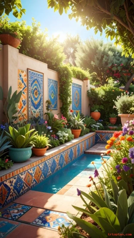 Use colors like turquoise, cobalt, terracotta, and warm white. Keep the mosaic in one zone so it does not overwhelm the garden. Seal grout properly for outdoor use.
