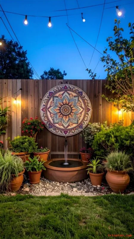 Pair the mosaic area with simple plants and neutral decor. Add a water feature nearby to match the tile vibe. This fence idea feels bold and joyful.