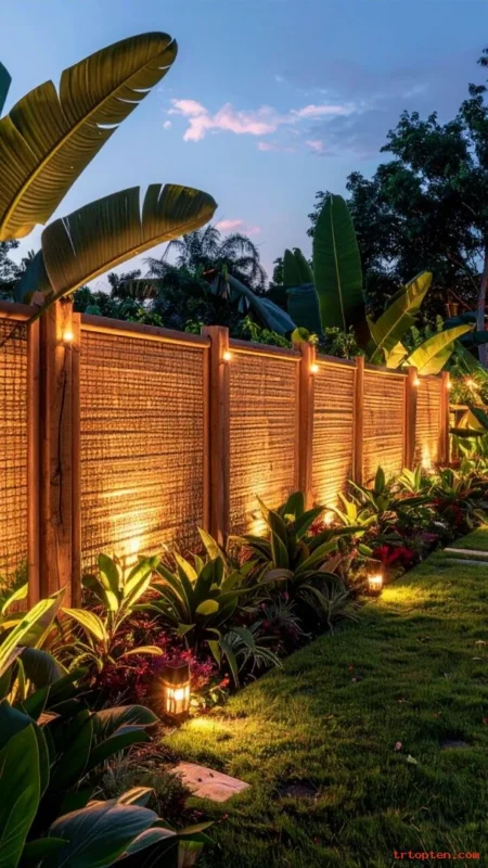 Add plants with large leaves to match the woven look. Use warm lighting to highlight the pattern at night. This fence idea fits modern boho yards well.