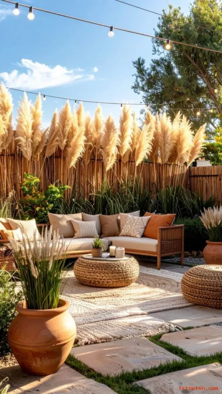 Place tall pampas grass in big planters along the fence line. The feathery plumes echo the fence texture and add height. Keep the pots in terracotta or woven baskets for a warm look.