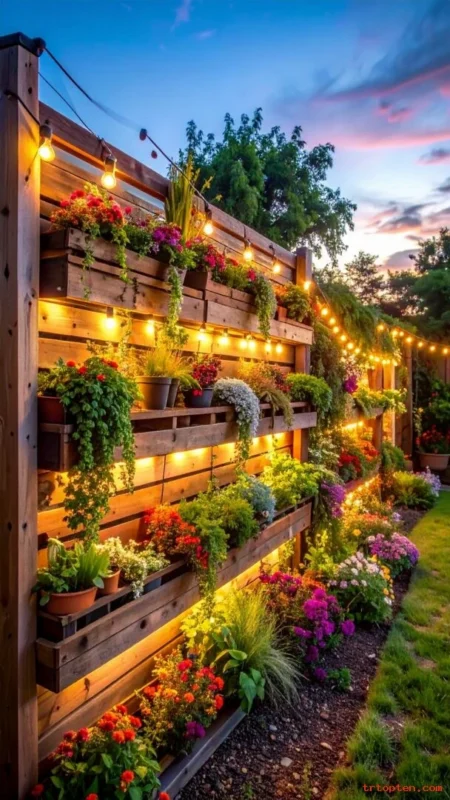 Finish with string lights woven through the slats for a cozy night glow. Add small signs or hand-painted patterns for a personal touch. This fence turns a plain boundary into a living backdrop.