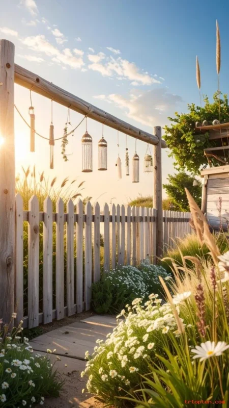 Add shells, simple beads, or small wind chimes for gentle movement. Pair with beach grasses and white flowers for a light look. This fence idea shines in sunny yards.