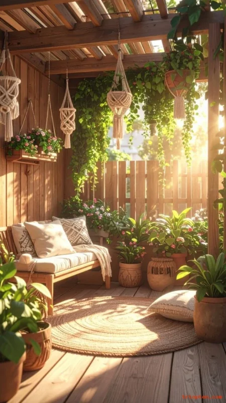 A bamboo fence gives you instant boho texture because the canes create soft lines and natural color. You can attach macramé panels to sections of the fence to add a handmade, breezy look. This style works well behind a seating nook or a small herb garden.