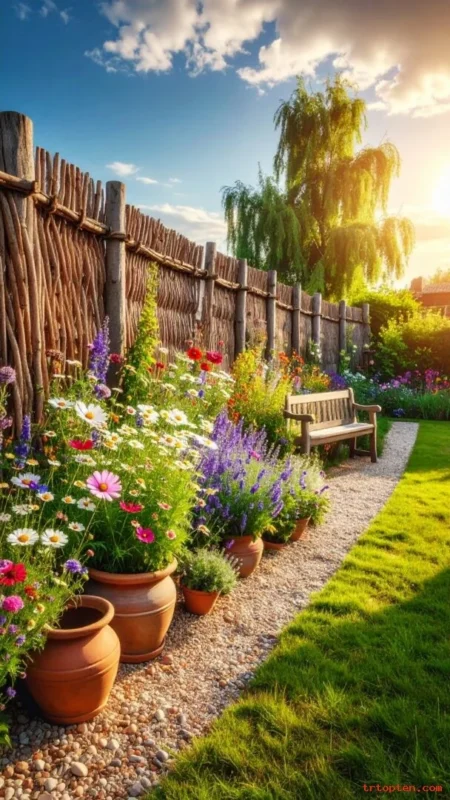Add a simple wooden gate and a gravel path for extra charm. Use clay pots and a small bench to complete the scene. This fence looks best when you keep the garden slightly untamed.