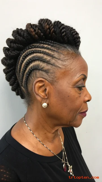 A faux hawk style offers an edgy yet sophisticated look for mature women. Cornrows are braided from both temples toward the center of the head. The hair in the center section is then picked or brushed up and secured.