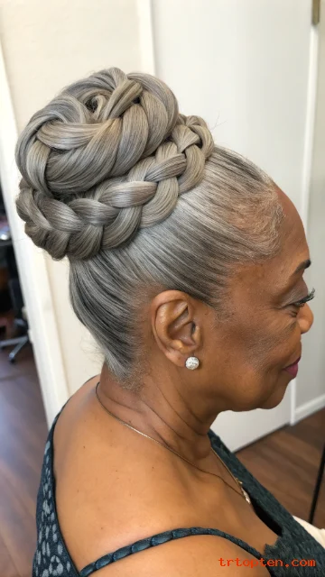 This braid style beautifully incorporates gray or silver hair. It keeps all hair up and securely in place. An infinity braid bun is a work of art.