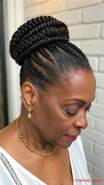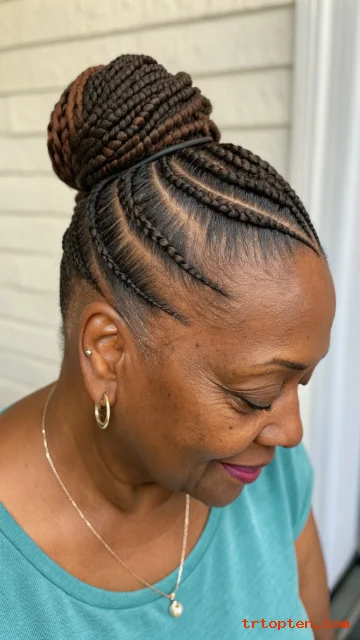 Ask for neat cornrows in front and braids gathered at the nape. Keep the bun compact to reduce weight. Use pins that match hair color.