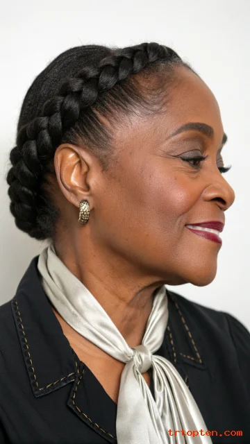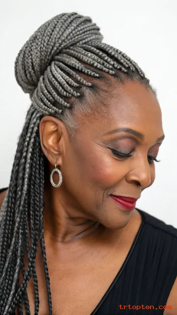This style pairs well with gray blending and subtle highlights. You can tuck one side behind the ear for a clean profile. Add a few face-framing braids to soften the forehead area.