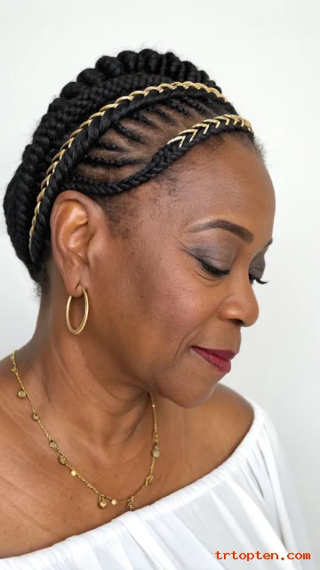 A cornrow crown gives a regal look. The braids wrap the head and create a clean outline. It keeps hair protected and off the neck.