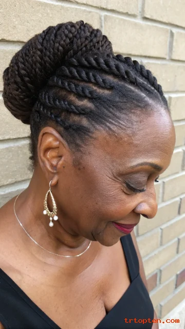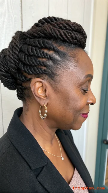 Flat twists lay close to the scalp and look refined. An updo keeps the style neat and formal. This is a strong choice for thinner hair because it looks smooth.