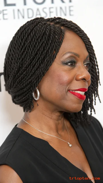 Senegalese twists look sleek and smooth. A tapered bob shape gives a lifted look around the cheekbones. This style feels light and tidy.
