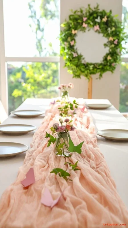 A table runner creates a strong base for decor. Use gauze, tulle, or linen in a soft color, then layer greenery on top. Scatter paper butterflies across the runner.