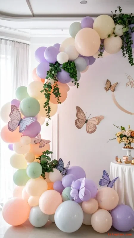 Build a balloon garland in blush, lilac, ivory, and soft green for a garden mood. Add paper butterfly wings so the garland looks like it is in motion. Place it behind the dessert table for instant impact.