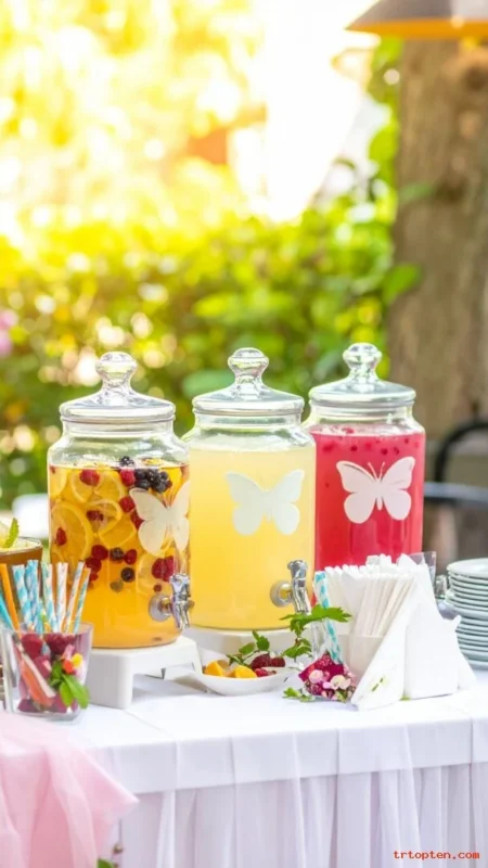 A drink station keeps guests moving and helps the party flow. Label water, lemonade, iced tea, or mocktails with butterfly tags. Add striped paper straws for a playful touch.