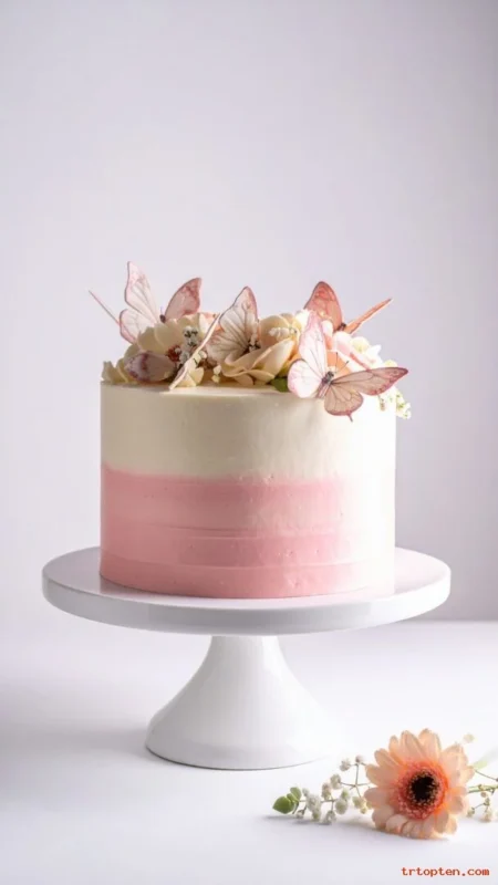 A butterfly cake looks elegant and theme-perfect. Add sugar butterflies that look like they are landing on the cake. Use soft ombré frosting or a simple white base with florals.