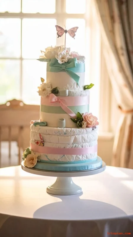 Keep the diaper cake tight so it holds shape during the party. Use small baby items like pacifiers or socks as accents. Add a simple sign that says “Diaper Sprinkle” or “Diaper Cake.”