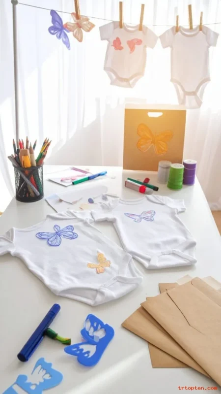 Onesie decorating keeps guests engaged and gives the parents useful gifts. Set out plain onesies, fabric markers, and butterfly stencils. Add a sign with simple guidelines.