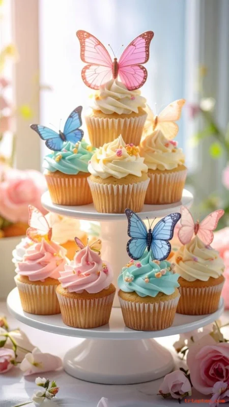 Choose frosting colors like cream, blush, lavender, or pale yellow. Add a light dusting of shimmer for a “wing” effect. Arrange cupcakes on a tiered stand for height.