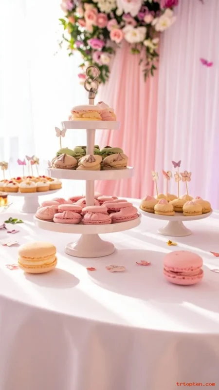 A dessert table becomes the visual heart of the party. Use a tiered layout with cake, cupcakes, cookies, and candies in matching colors. Add butterfly labels and a simple backdrop.