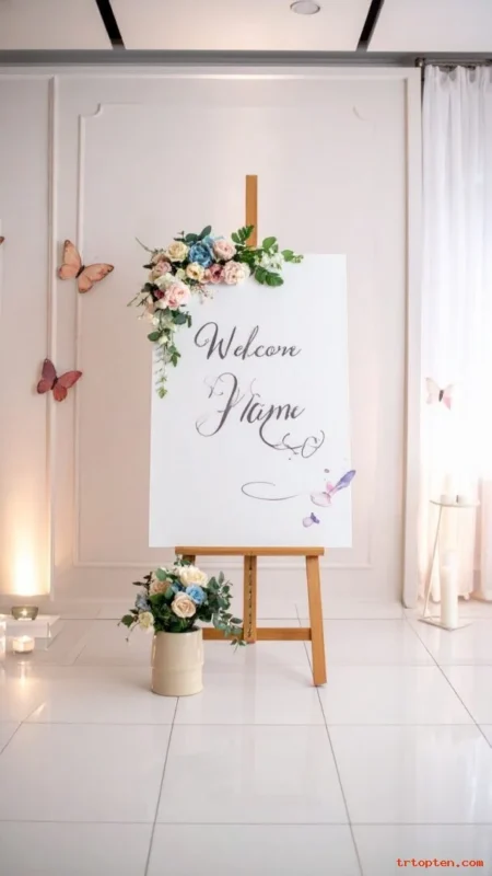 Choose a font that stays readable from a distance. Add a small floral cluster at the bottom so it feels finished. Match the sign colors to your invitations for a clean look.