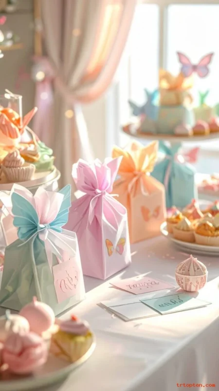 Butterfly cookies, small candles, tea, and mini lotions work well. Wrap favors with ribbon and a butterfly tag for theme. Keep favors easy to carry and not too fragile.
