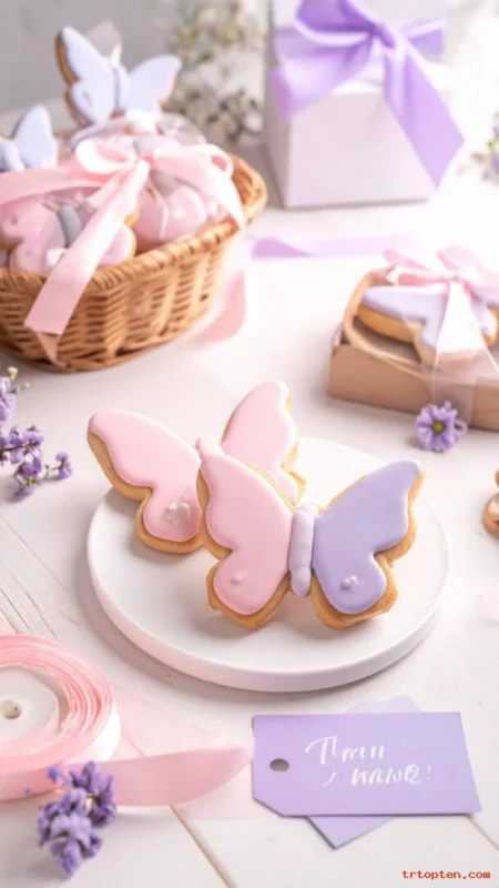 Cookies work as both decor and take-home favors. Shape them like butterflies, flowers, or baby onesies with butterfly icing details. Wrap each cookie in clear bags with ribbon.